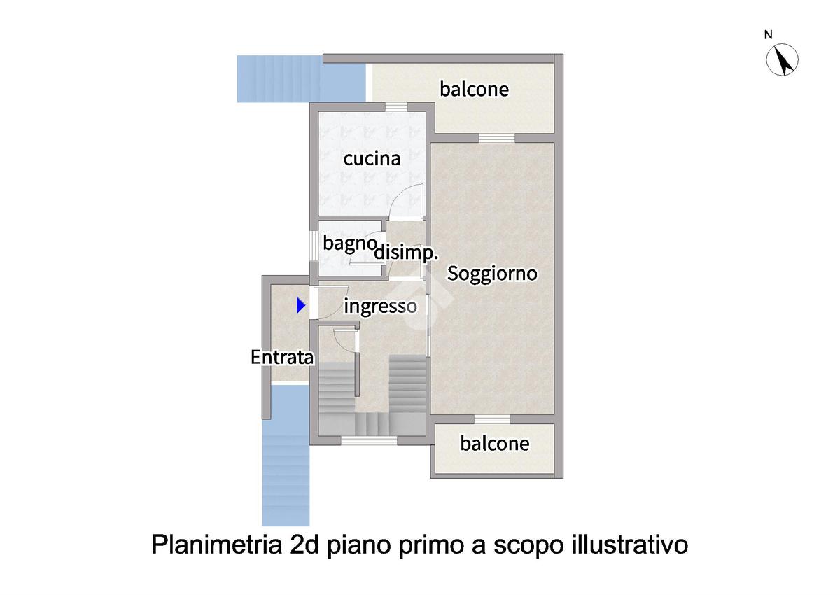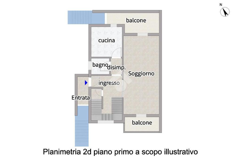 L’ingresso principale si trova al piano primo ed è raggiungibile tramite una scala esterna. Il livello ospita la zona giorno composta da soggiorno con doppia esposizione e uscita su due balconi, cucina separata e abitabile e un bagno finestrato a servizio del piano. Dal balcone del soggiorno in comune con quello della cucina è possibile accedere direttamente al giardino tramite una scala esterna.