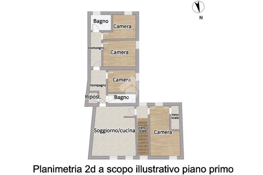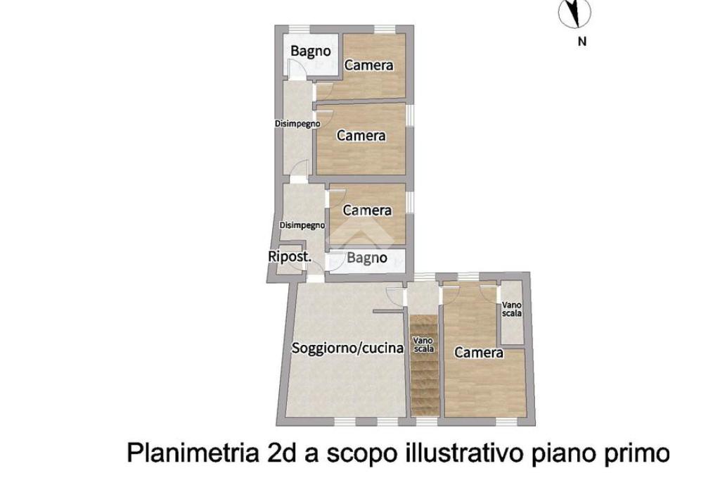 Il piano primo è composto da una zona giorno con angolo cottura, un disimpegno che conduce alla zona notte composta da tre camere da letto e due bagni completi di doccia, di cui uno finestrato. Completa il piano un ambiente utilizzabile come studio o ulteriore soggiorno.