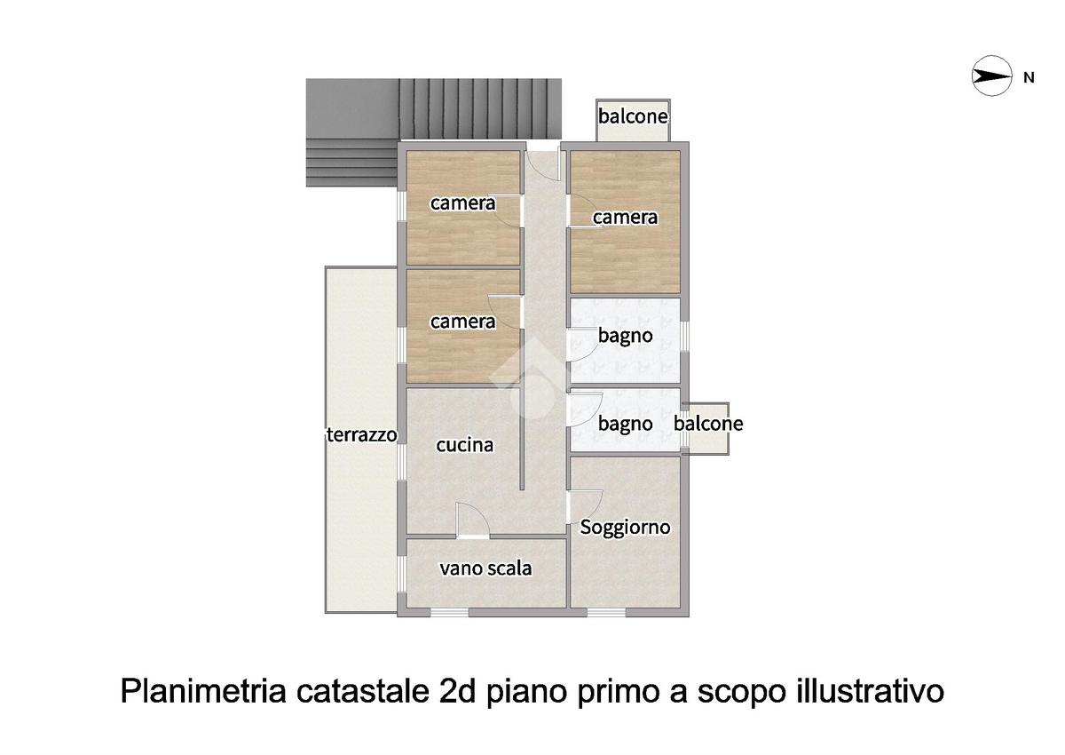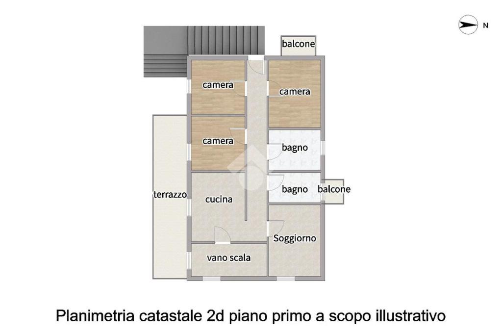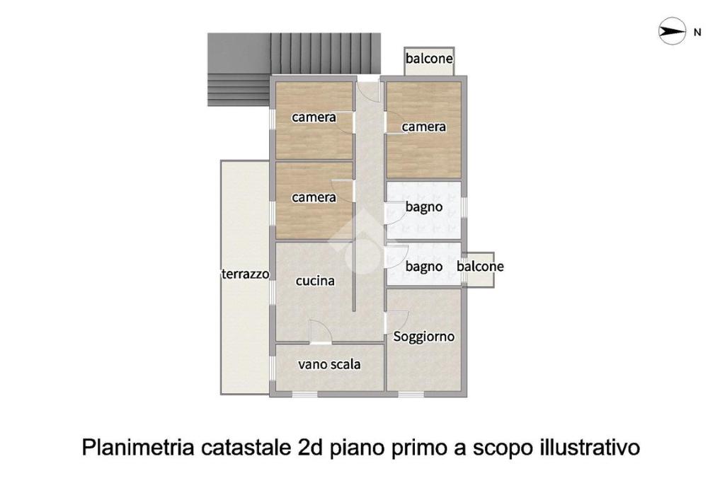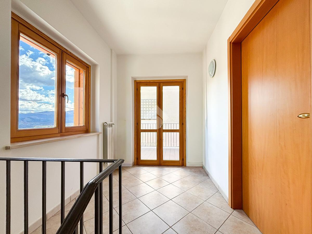L'appartamento al primo piano è composto da: ingresso sul soggiorno con angolo cottura, quattro camere da letto e due bagni finestrati, uno con doccia e uno con vasca. Inoltre la soluzione gode di un comodo terrazzo accessibile sia dalla zona giorno sia da una delle camere da letto.