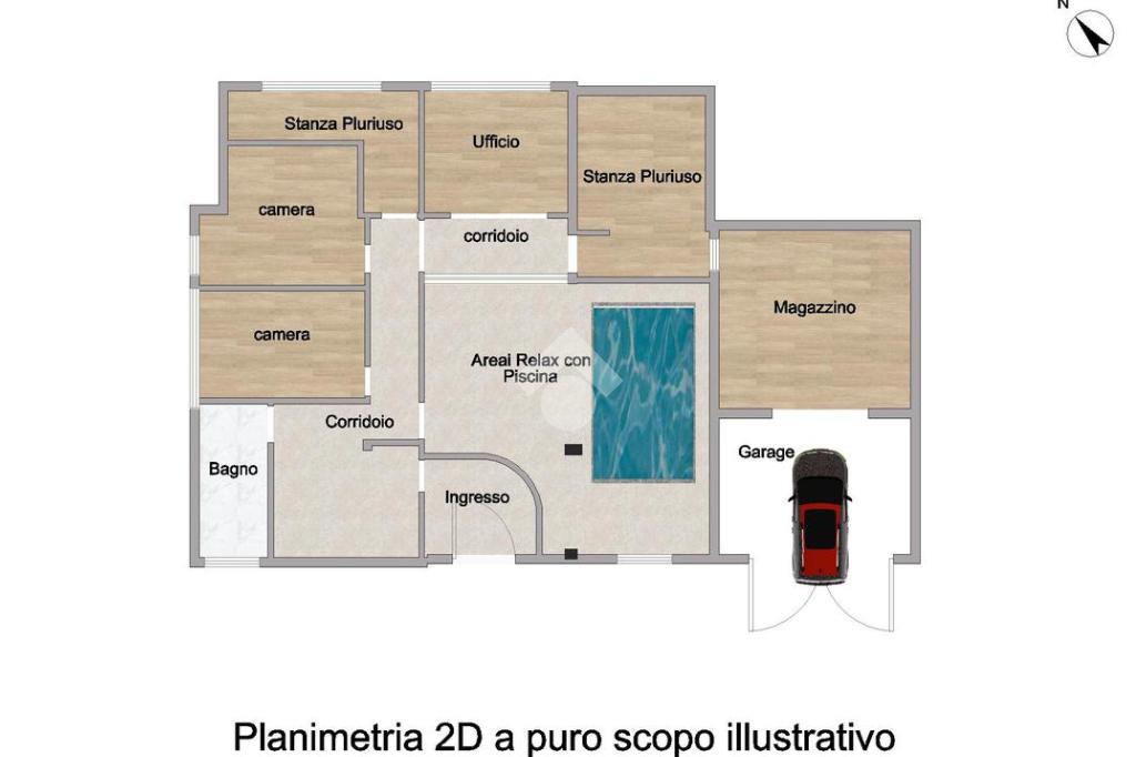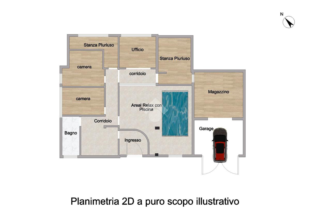 Infine al piano seminterrato, accessibile mediante un secondo vano scala interno oppure attraverso un ingresso indipendente esterno, si trovano un'area relax con piscina, tre stanze di cui due adibite a camera e una come locale ripostiglio, il locale tecnico (centrale termica), un locale lavanderia, il bagno completo e finestrato, l'intercapedine ispezionabile e il garage di 38 mq.