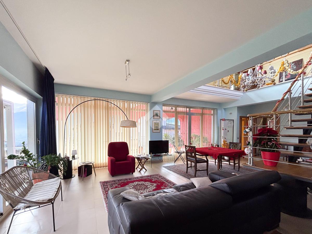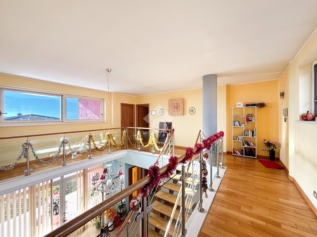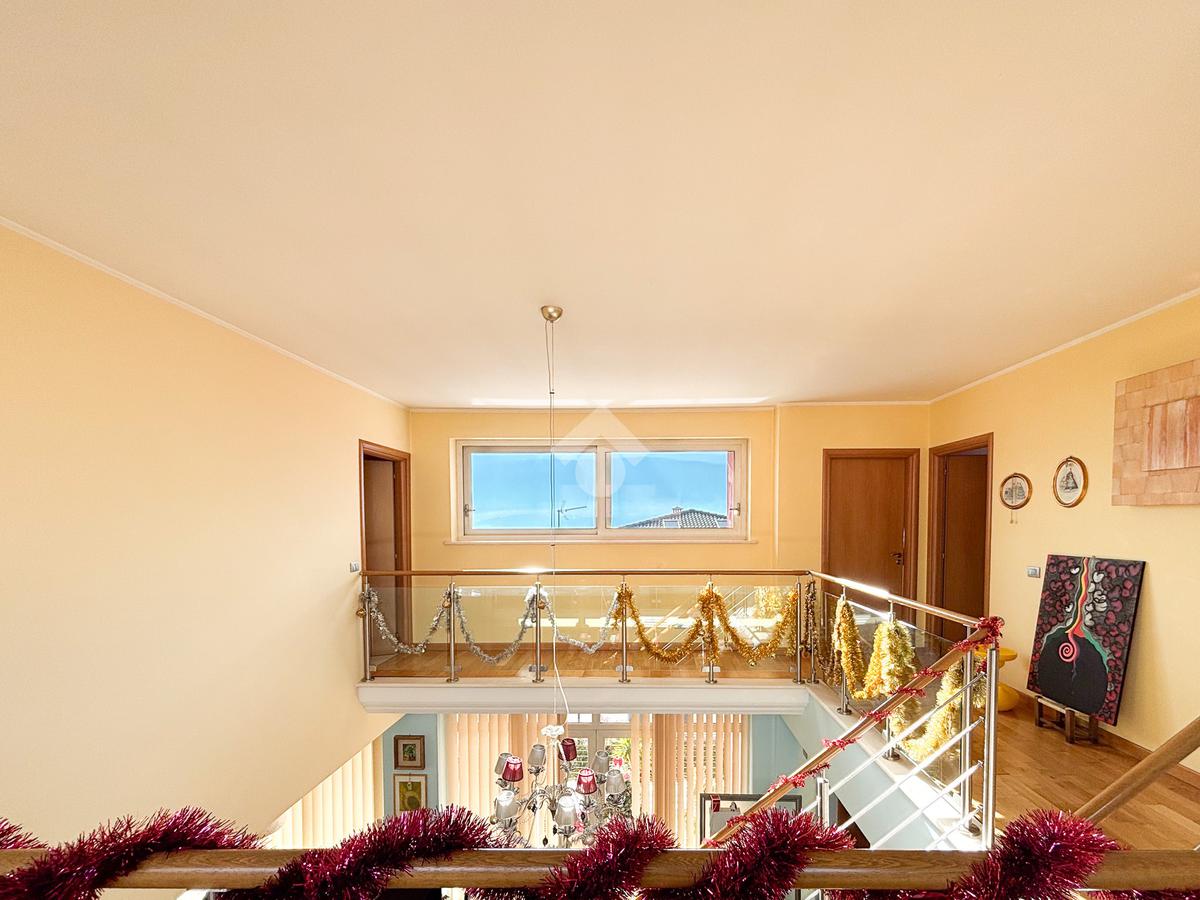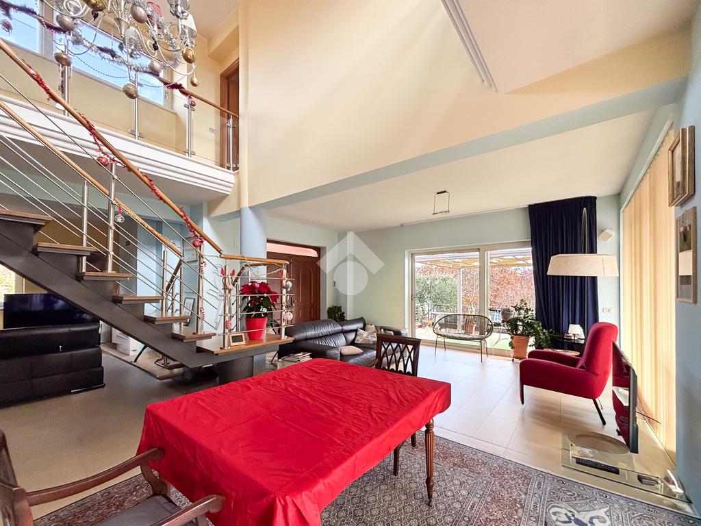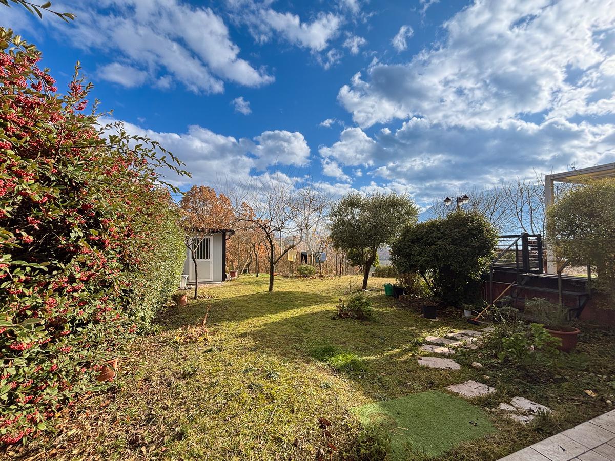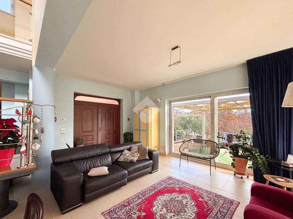 Al piano terra, dall'ingresso porticato, si ha accesso sulla zona living con doppia altezza, con uscita sul terrazzo coperto con vista panoramica a sud e sul giardino con solarium. Completano il piano la cucina abitabile con piccola loggia esterna, un ambiente uso studio, sul quale affaccia il secondo ingresso del piano, e bagno completo di doccia e finestrato con antibagno.