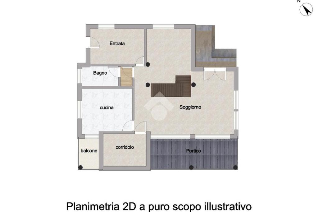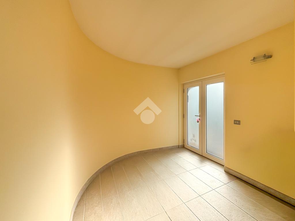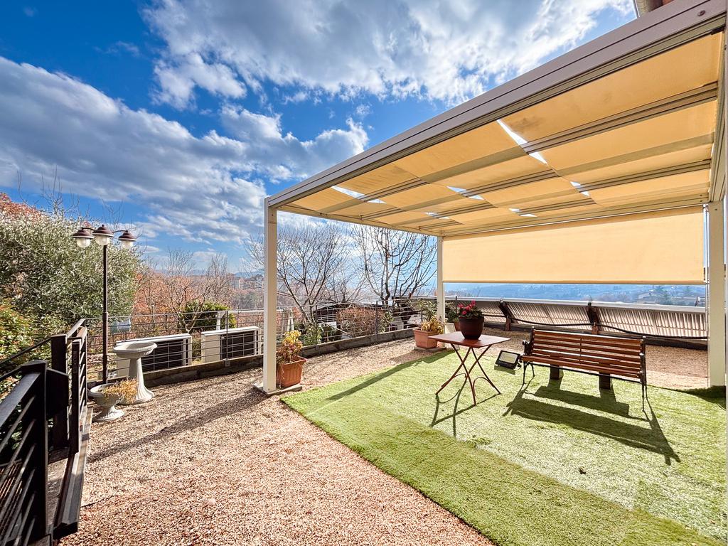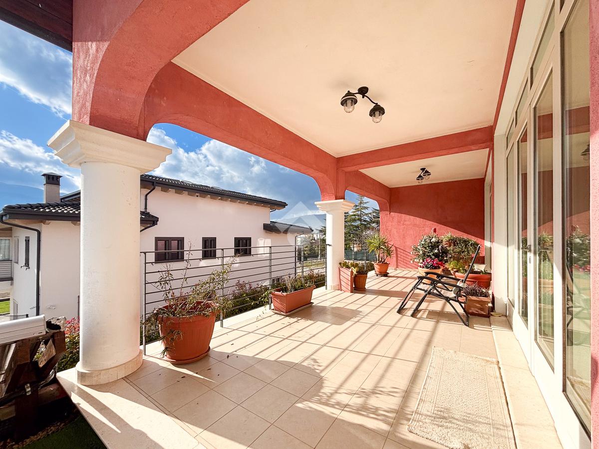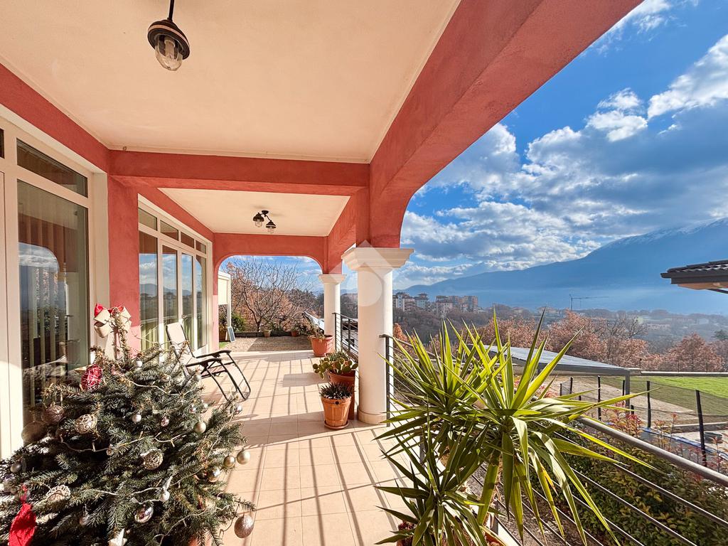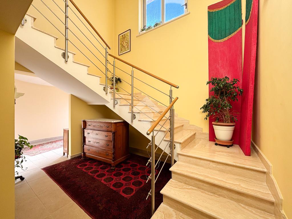 Al piano terra, dall'ingresso porticato, si ha accesso sulla zona living con doppia altezza, con uscita sul terrazzo coperto con vista panoramica a sud e sul giardino con solarium. Completano il piano la cucina abitabile con piccola loggia esterna, un ambiente uso studio, sul quale affaccia il secondo ingresso del piano, e bagno completo di doccia e finestrato con antibagno.