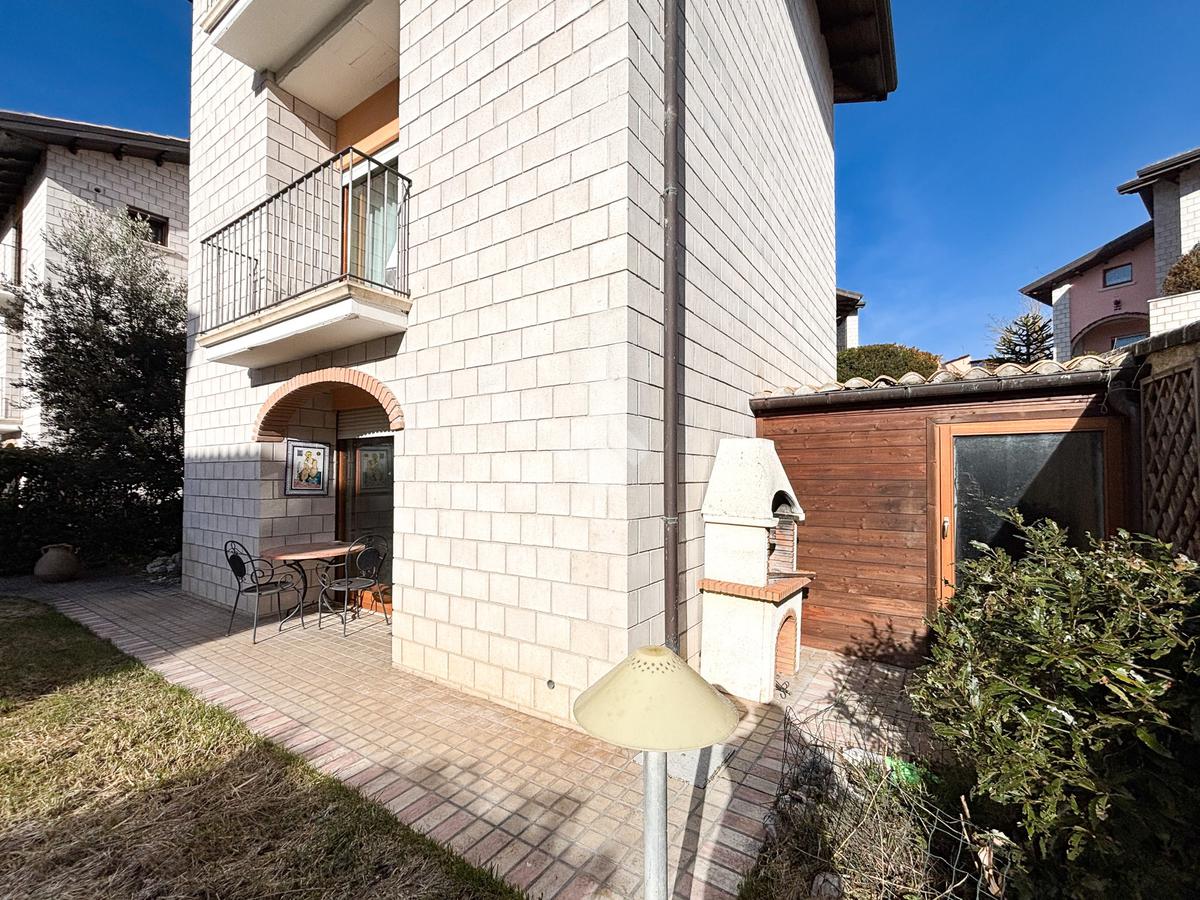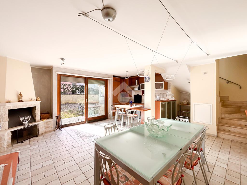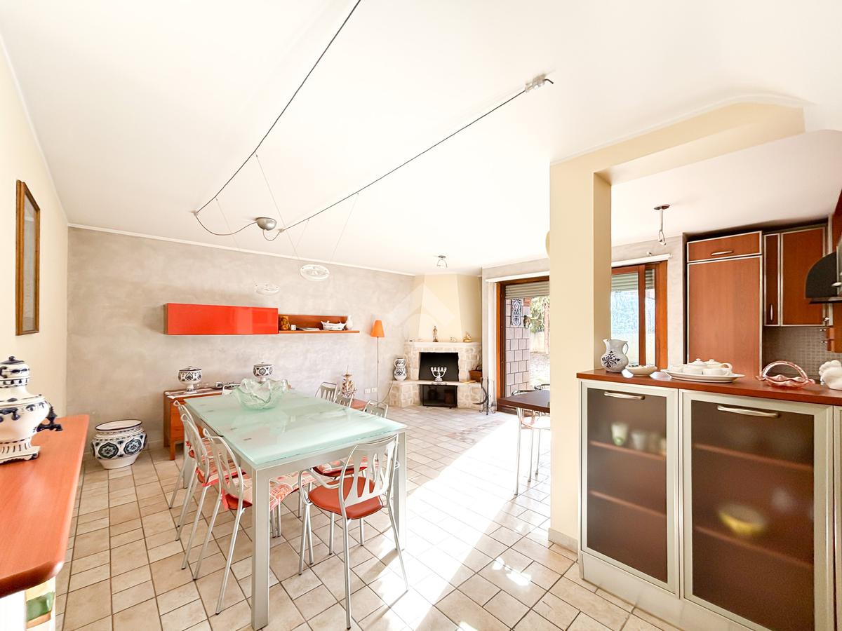 Al piano terra sono presenti la cucina con zona pranzo con camino e accesso diretto al giardino privato con angolo barbecue, un bagno finestrato con doccia a servizio della zona giorno, un ripostiglio e il garage con collegamento interno.