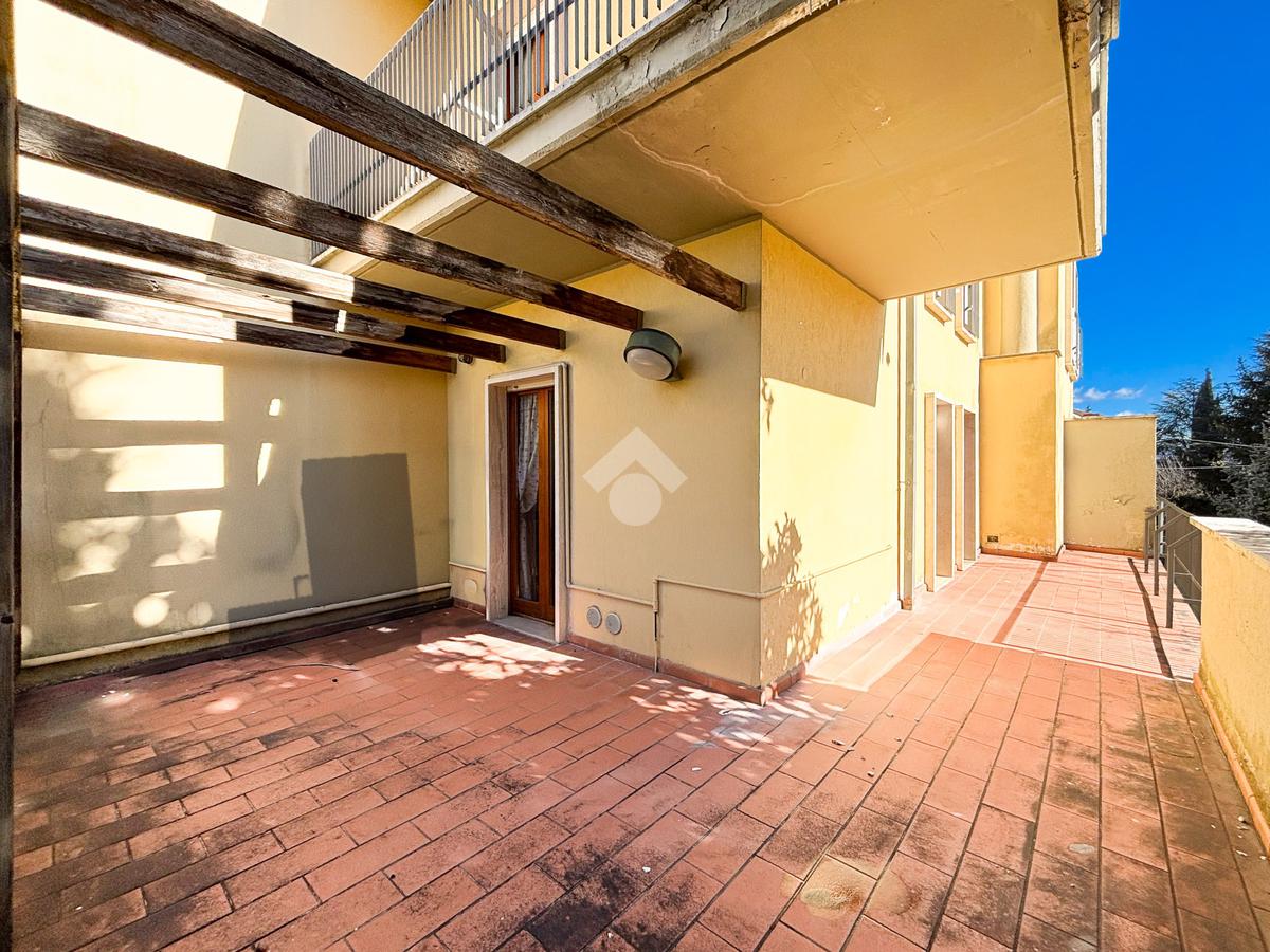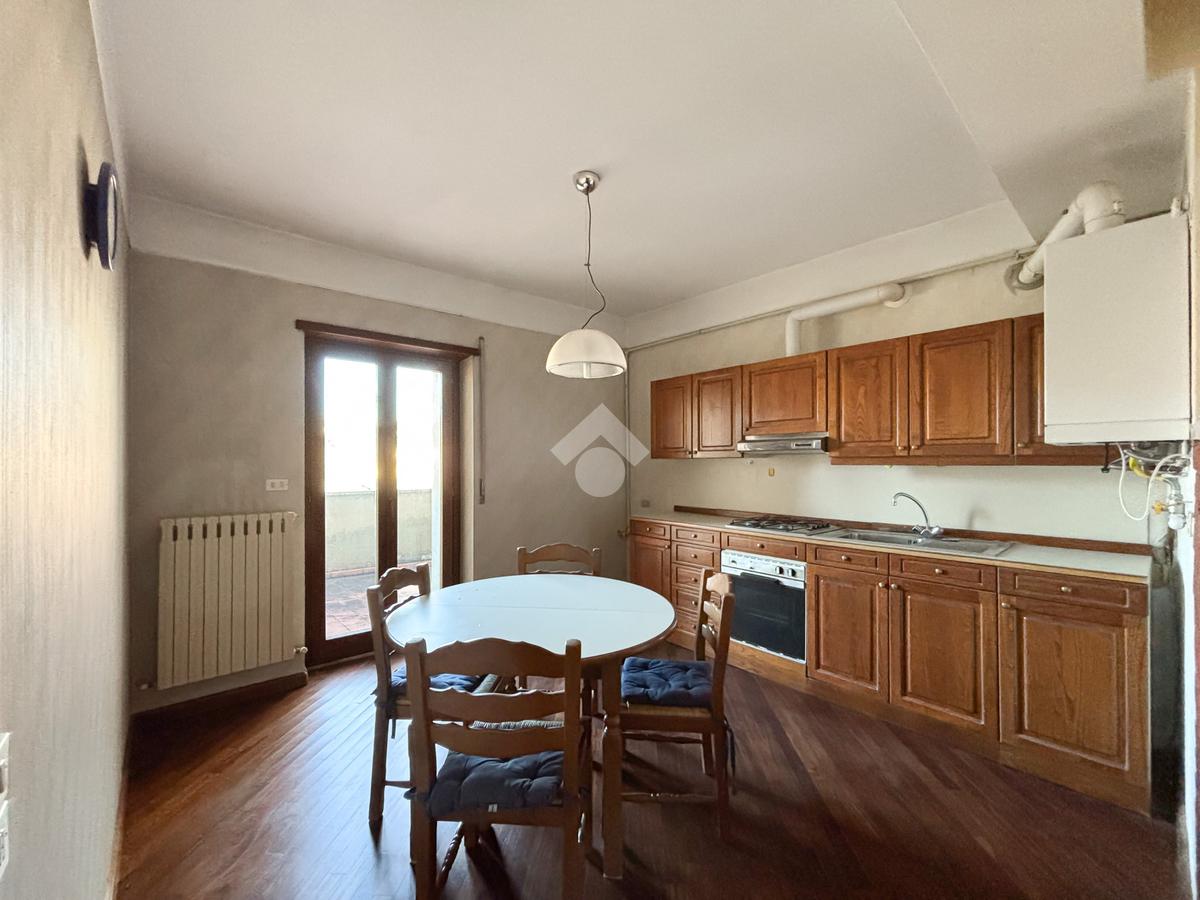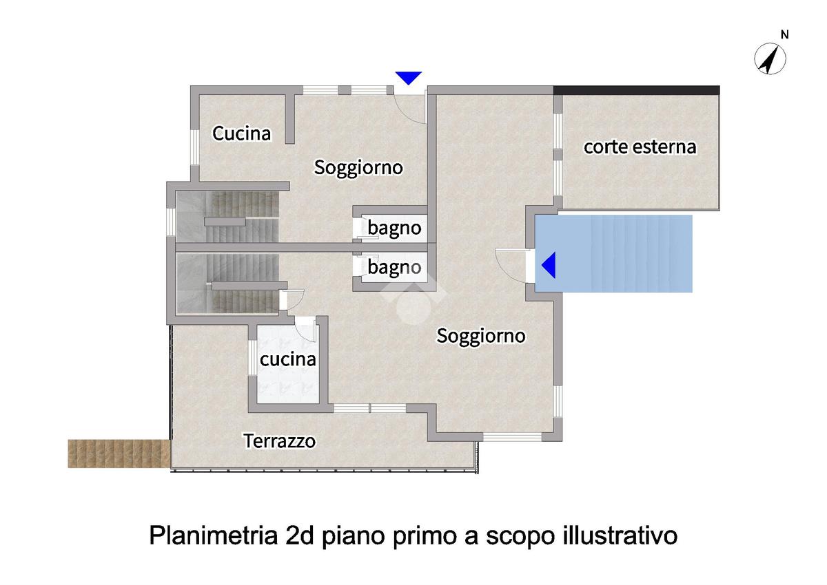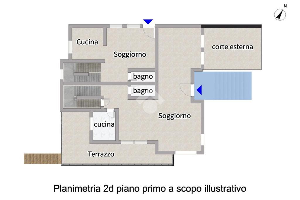 Il primo appartamento, con ingresso laterale al piano primo, è composto da soggiorno con camino, cucina abitabile e bagno di servizio; al piano superiore si trovano una camera matrimoniale, una camera singola e un bagno finestrato con vasca.